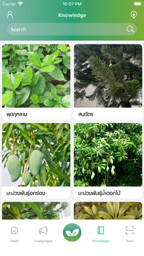 5. ความรู้ (Knowledge) การแสดงข้อมูลเกี่ยวกับต้นไม้ ผู้สนใจสามารถเรียนรู้วิธีการปลูก การดูแลรักษา และคุณประโยชน์ของต้นไม้แต่ละชนิด โดยสามารถค้นหา หรือเลือกดูข้อมูลต้นไม้รายหมวดหมู่ได้