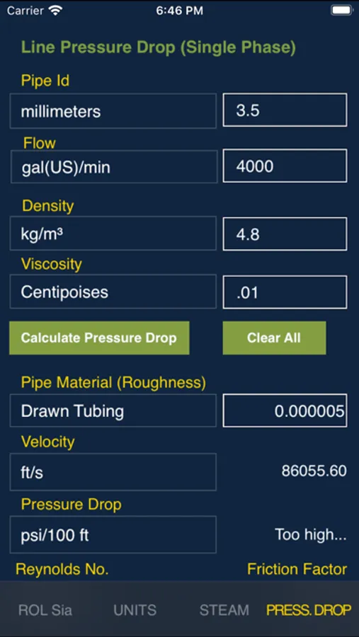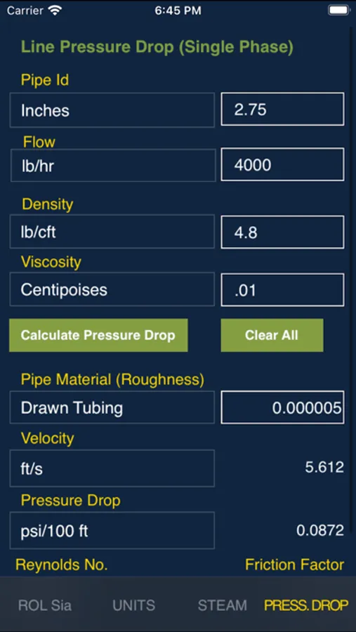 Line Pressure Drop: Single phase line pressure drop calculation for different pipe sizes and materials in English or Metric units.