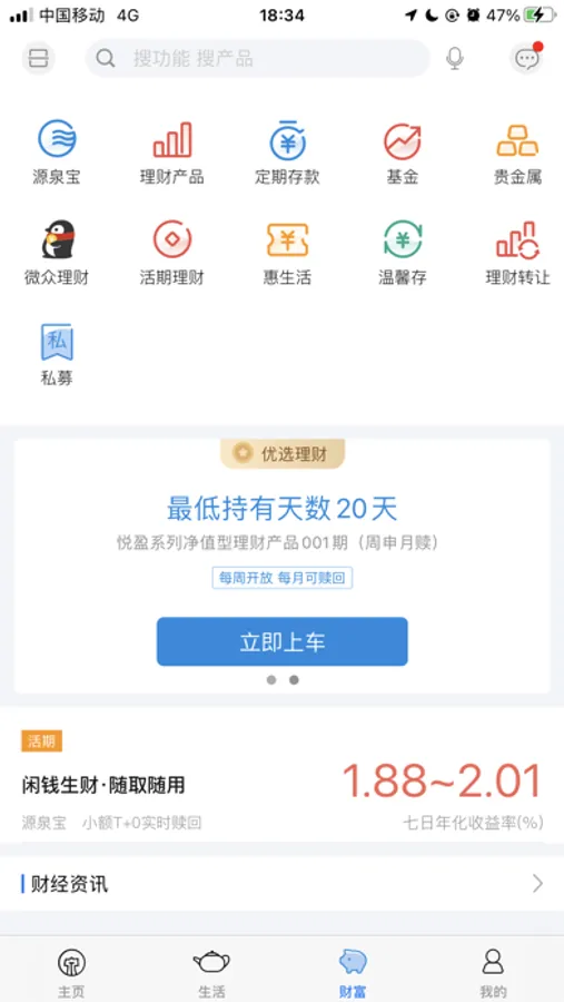 更清晰的功能分区,针对泉州银行2.0提供的服务进行了全新梳理,实现生活、财富、账户模块分区,并在首页进行全功能展示,更方便用户快速查找想要的功能。