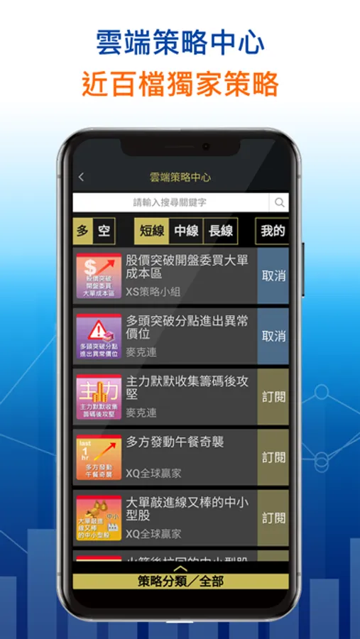 6. 策略中心:腦中沒想法沒關係,XQ雲端策略中心提供超過50種交易策略免費訂閱,股市交易輕而易舉
