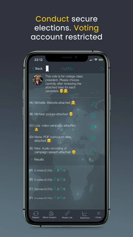 Conduct secure ELECTIONS from your mobile phone & view instant results with a gender breakdown; voters vote from their mobile phones