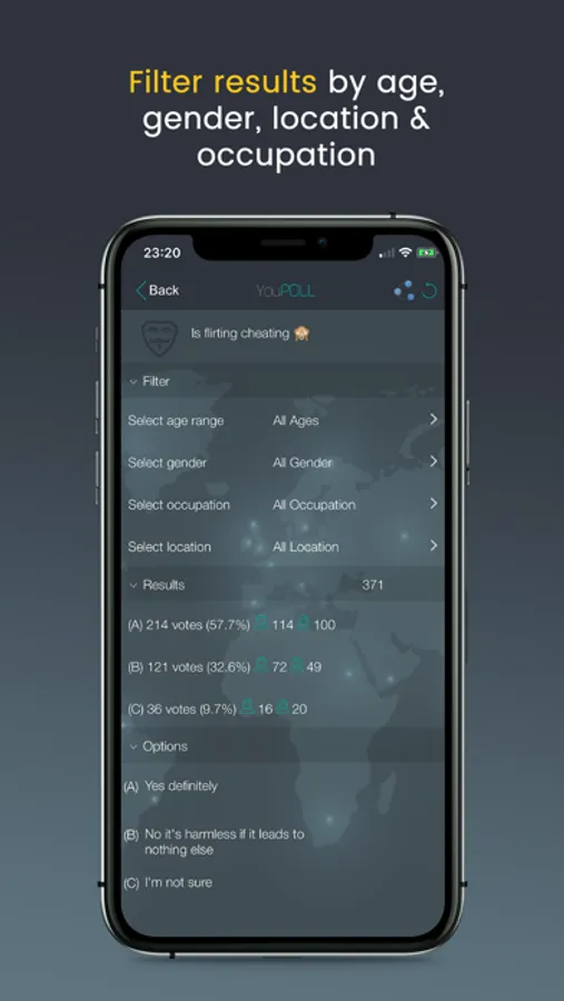 View detailed voting statistics on polls and surveys filtered by demographic data such as age, gender,location and occupation of voters