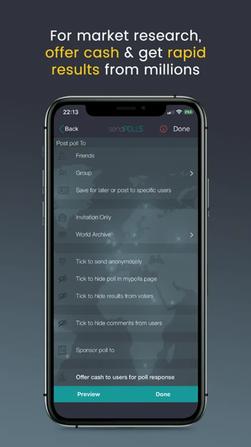 Send advanced polls and surveys to the mobile phones of friends, GROUPS, anyone, everyone or target a specific demographic FOR FREE !
