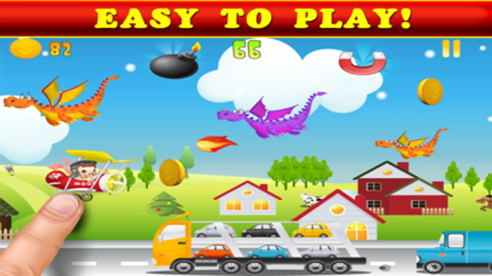 Kids can fly a plane by touching and moving it on the screen. Collect crazy power-ups on your flight over colorful landscapes. Watch out for the cute dragons and cars.
