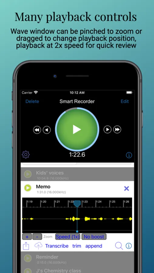 Smart Recorder is a full featured recorder and transcriber offering many features beyond what is available in the built in voice memos app. The Smart Recorder family of products has over 1,000,000 device installs. It has been actively marketed and updated for seven years. Use it to record meetings, interview, lectures, classes, todo lists, shopping lists or even your kids voices.