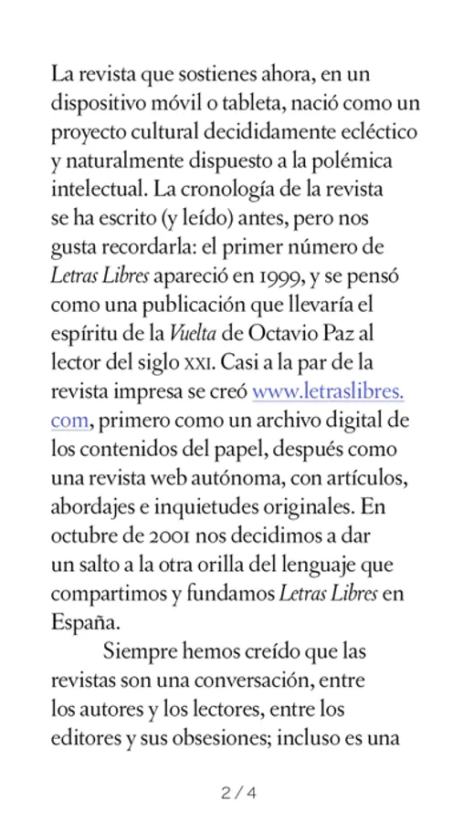 A la par de la revista impresa se creó letraslibres.com, primero como un archivo digital de los contenidos del papel, después como una revista web autónoma, con artículos e inquietudes originales. Además, desde septiembre de 2013 sumamos una plataforma más: una revista para