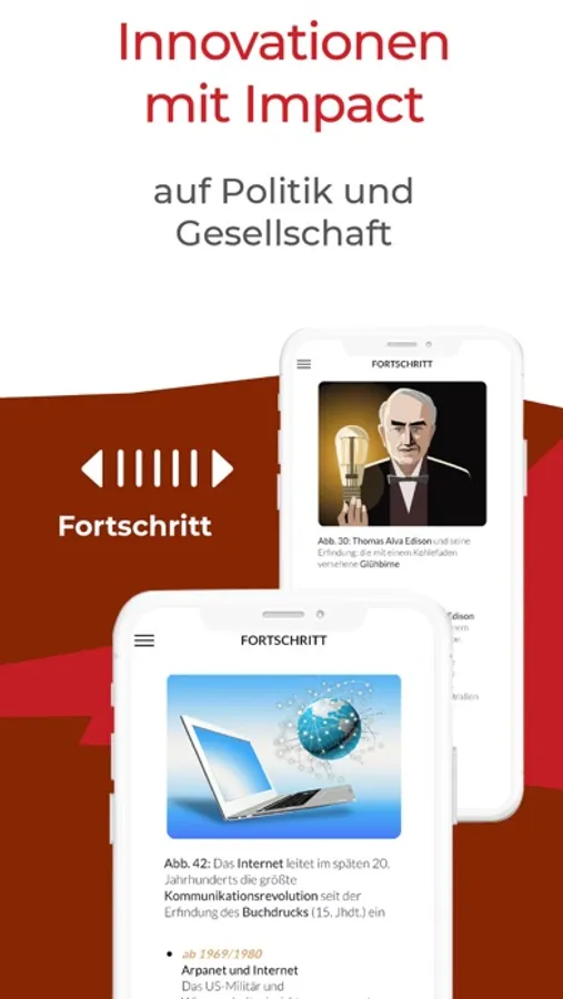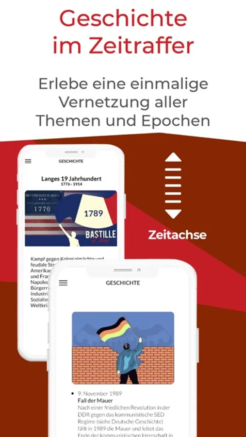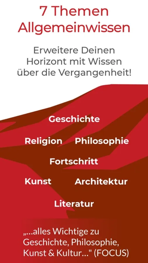 Pro-Version: Alle Themen über 6 Epochen, (von der Antike bis zur Gegenwart); Maxi-Quiz mit Feedback Funktion sowie unser regelmäßiger Wissens-Snack