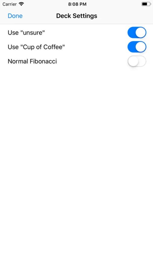 The Normal cards in the deck have numbers on them. A typical deck has cards showing the Fibonacci sequence including a zero: 0, 1, 2, 3, 5, 8, 13, 21, 34, 55, 89; other decks use similar progressions. Like: 0, ½, 1, 2, 3, 5, 8, 13, 20, 40, 100, and optionally a ? (unsure)