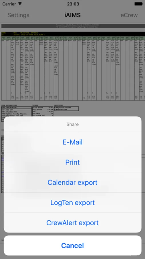 You can also print and E-Mail and export your schedule to a calendar, LogTen(c) and Jeppesen Crew Alert.