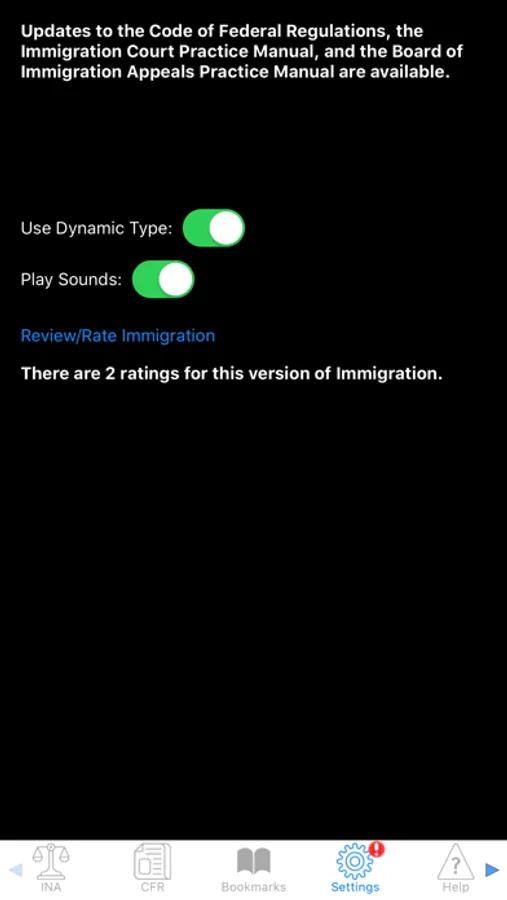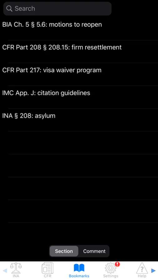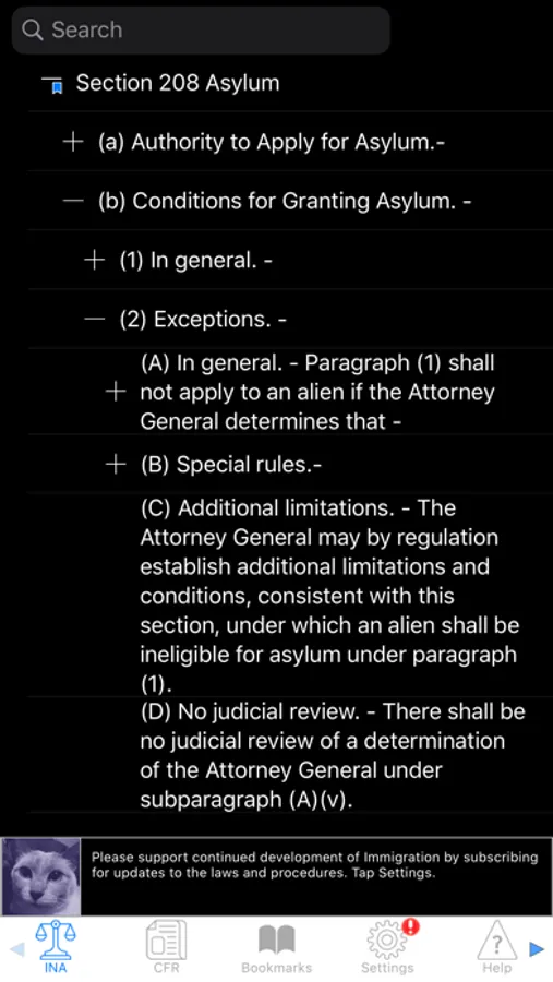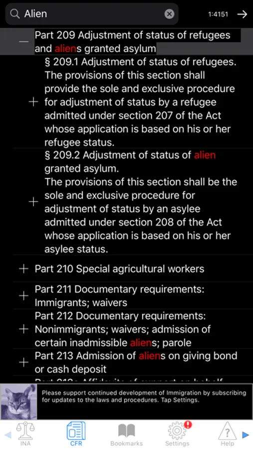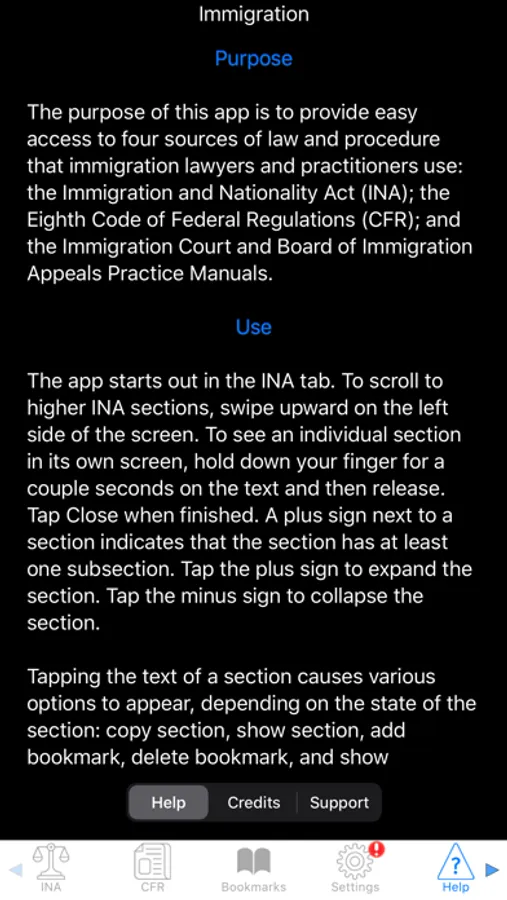 This app, Immigration, addresses the shortcomings of books and websites. Users can easily navigate to desired subsections of the INA, CFR, and Practice Manuals with a few taps. Users can quickly search for specific words or phrases, seeing each subsection that contains them. For example, a search for "visa petition" in the CFR immediately reveals 95 subsections containing that phrase. Users can apply named bookmarks to any subsection and easily navigate these bookmarks. Users can jump between corresponding INA and CFR sections, for example INA § 240B and 8 CFR § 240.25, which both concern voluntary departure. Finally, users can set font size based on their devices' Dynamic Type setting or app-specific preference.