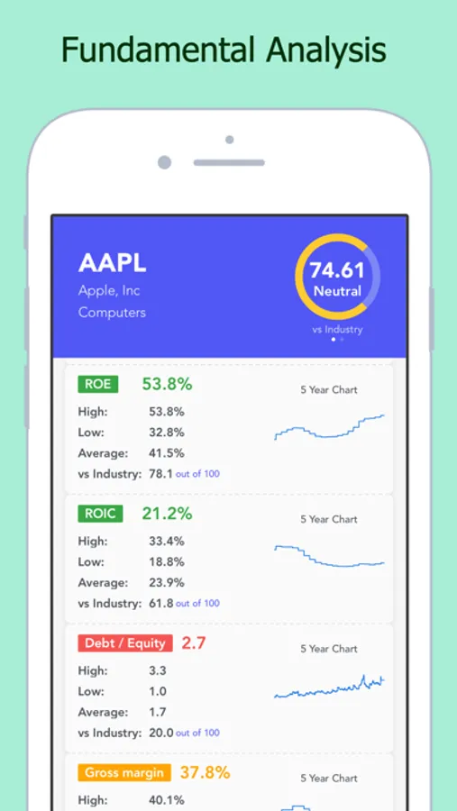 We analyze hundreds of fundamental indicators and many pieces of information of a stock and generate FA Scores for the stock and its relative strength in the overall market. Besides the score, you can also check the values and historical charts of several FA indicators like P/E, P/B, P/S, ROA, ROE, ROIC, D/E, Gross Margin, EBITDA Margin, Net Margin, etc. Know the good and the bad of the indicators.