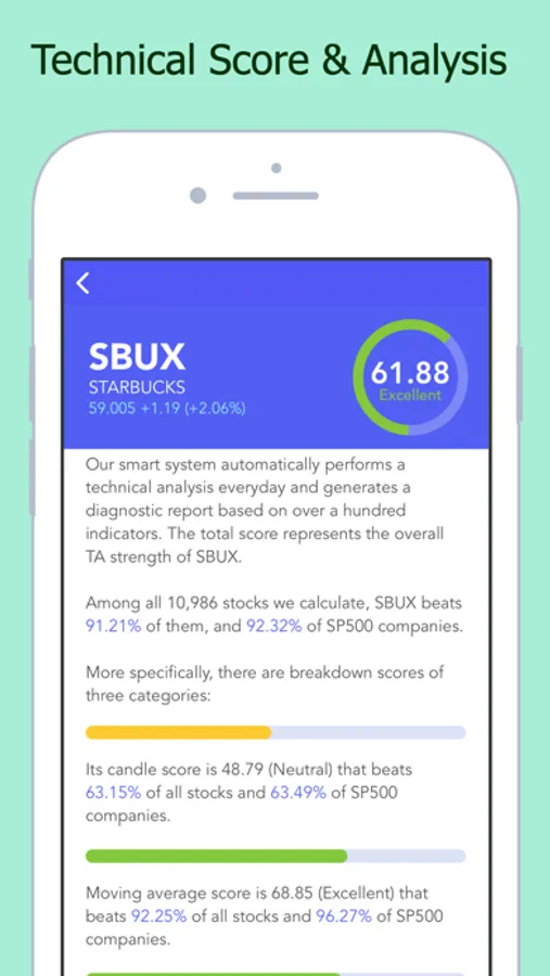 Our smart system automatically performs a technical analysis everyday and generates a diagnostic report based on many indicators. Check the overall TA strength of a stock, plus breakdown scores of different categories.