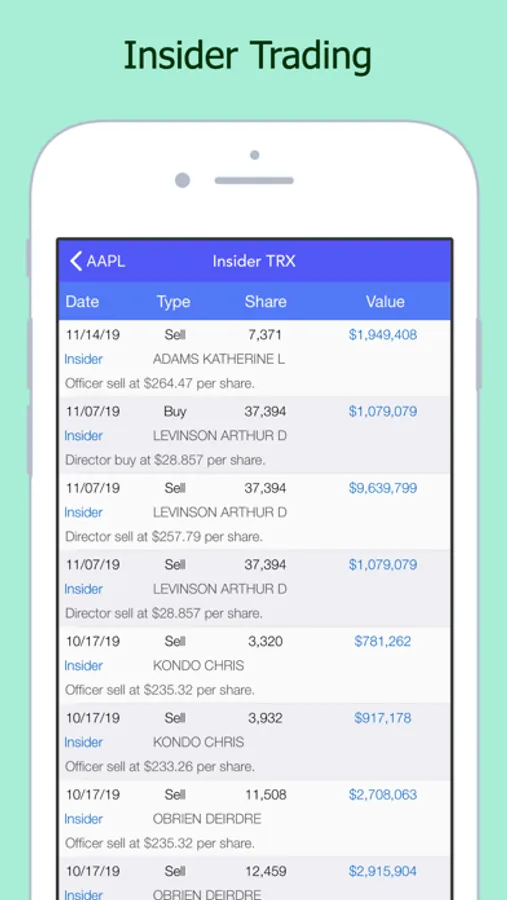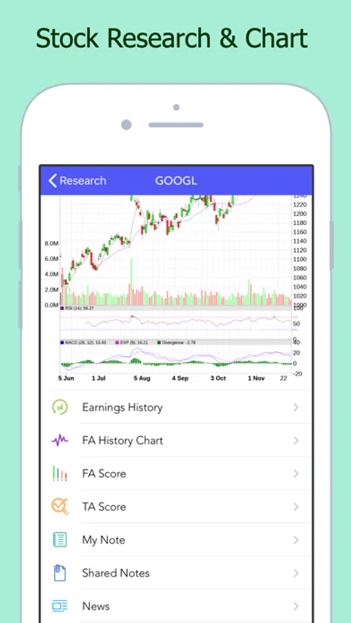 Enter a stock symbol in "Research" tab and view stock quotes and charts with multiple technical indicators, chart types, & date ranges. Customize the parameters and enlarge the chart to full-screen for detailed study. Check earnings history, read news, view insider tradings, write your notes, and see shared notes from others.