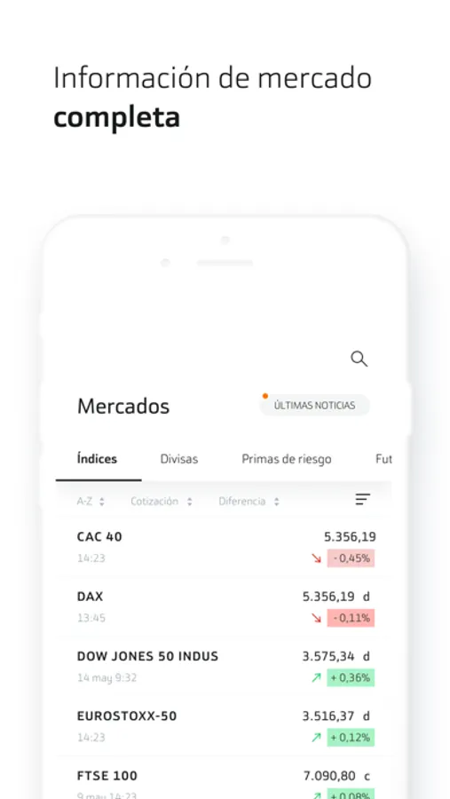 - Consultar principales índices bursátiles, divisas, tipos de interés, materias primas, deuda y prima de riesgo.