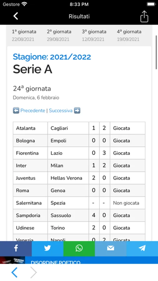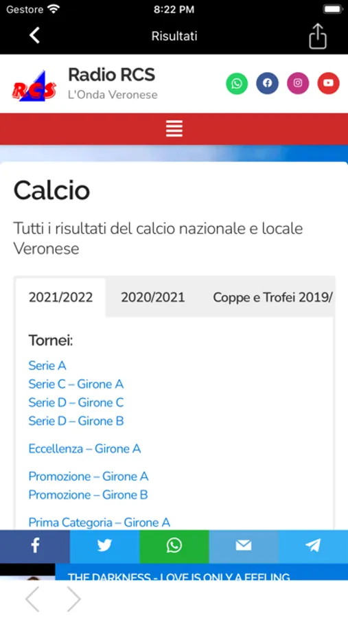 Risultati e classifiche del Calcio Veronese, in radio visione minuto per minuto, raccontato nella trasmissione RadioGrandeSport di Radio RCS, in onda tutte le domeniche sportive pomeridiane.