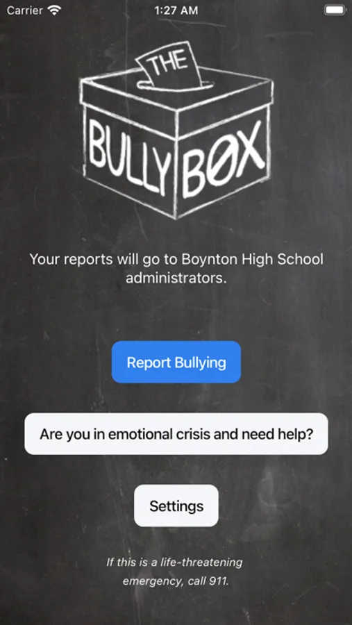 In order to make reports, schools must sign up for The BullyBøx at no cost to them at bullybox.org. The application is only useful if you are a parent or student in a participating school. If you would like to help bring The BullyBøx to your school, please check out the link in the "Marketing URL" section on this page.
