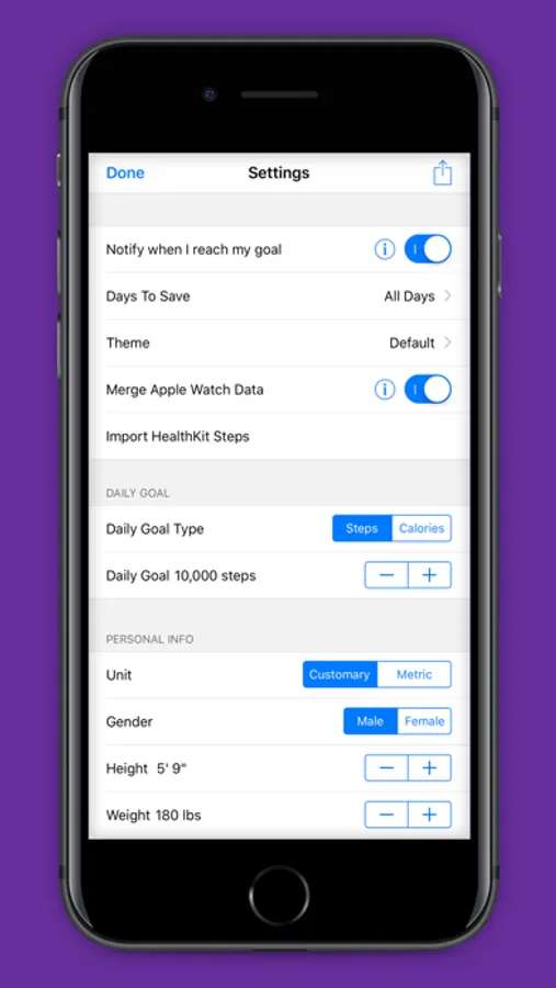 Steps+ also integrates with the Health application and allows you to bring in your step history, so you don't have to worry about not having access to your total step history.