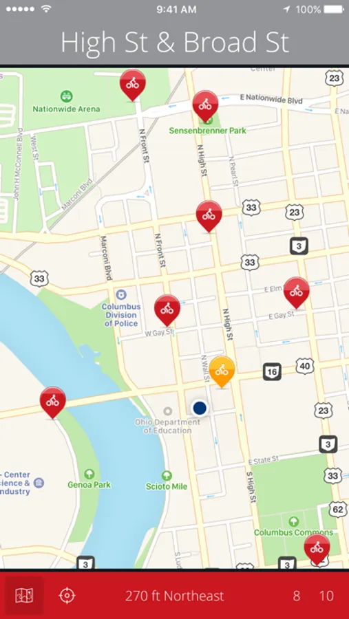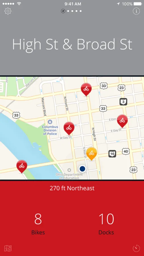 Columbus Bikes is a simple and easy-to-use App that helps you locate the closest CoGo Bike Share™ docking station. With one tap you can find the closest CoGo Bike Share station, how far away it is and in which direction, and how many available bikes and docks it currently has.