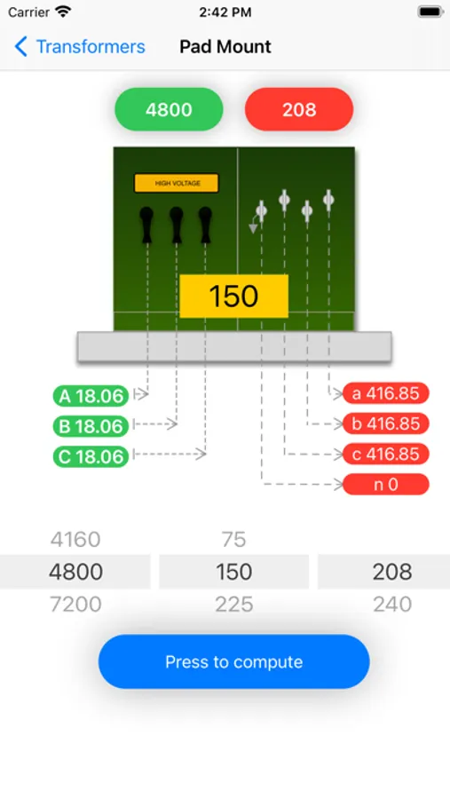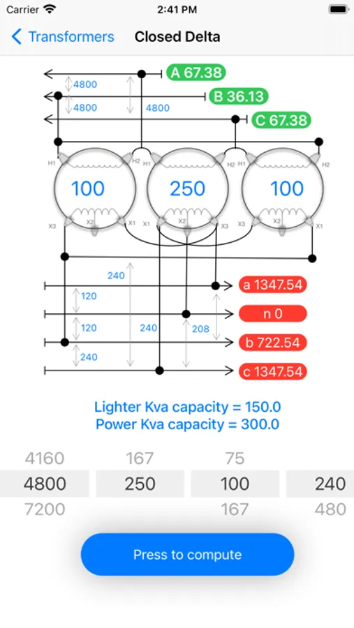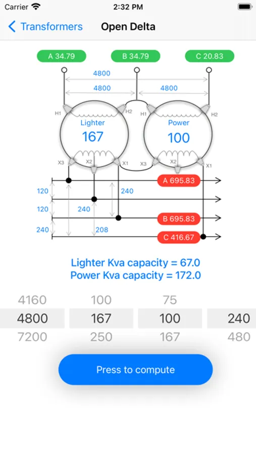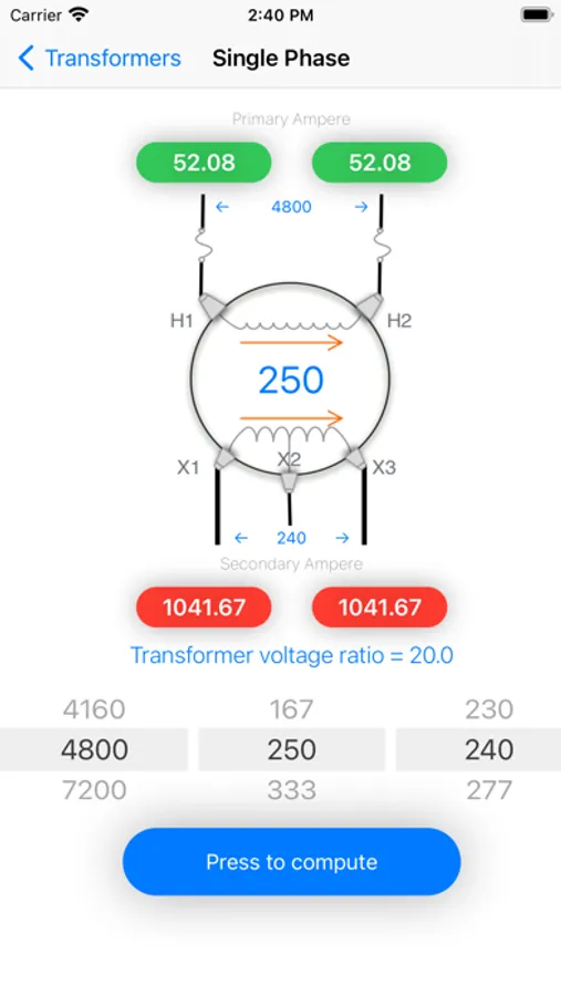 This application is designed to provide electrical transformer computation with the aid of formulas and drawings using standard transformer sizes and voltages. The layout is so simple, selecting values are easy as 123.