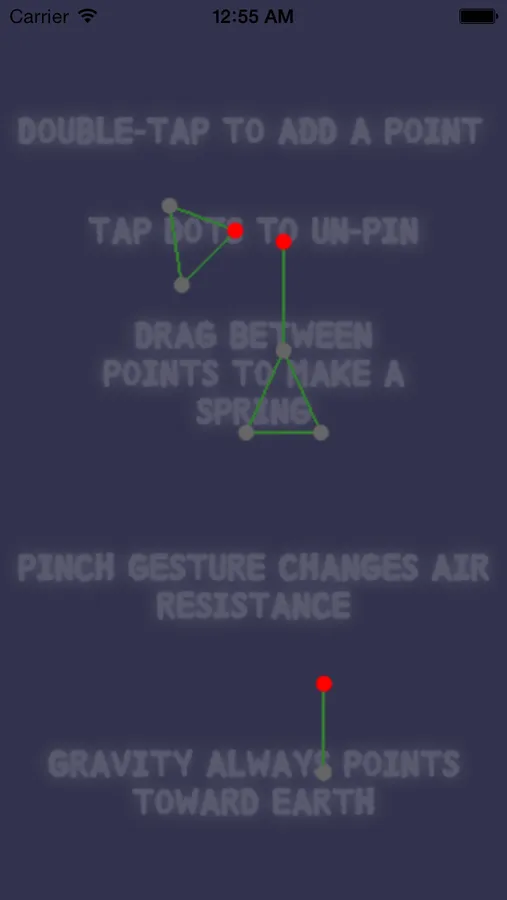 Double-tap the screen to add a point. Drag a line between two points to create a spring. Tap on a point to change whether it is pinned (red=pinned,gray=free). Rotate your iPhone to change the direction of gravity in the simulation. Doing a zoom-in or zoom-out gesture increases or decreases the force of air resistance.