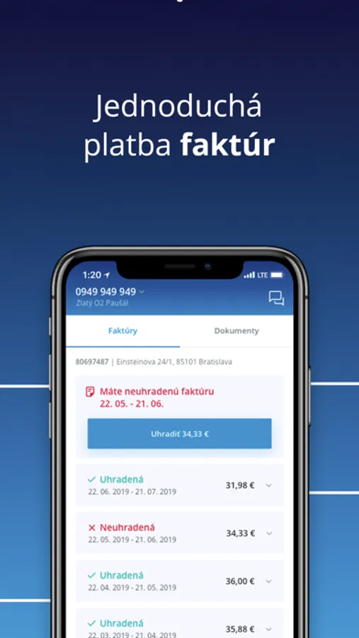 - uhradiť faktúry alebo dobiť kredit kartou alebo cez Apple Pay