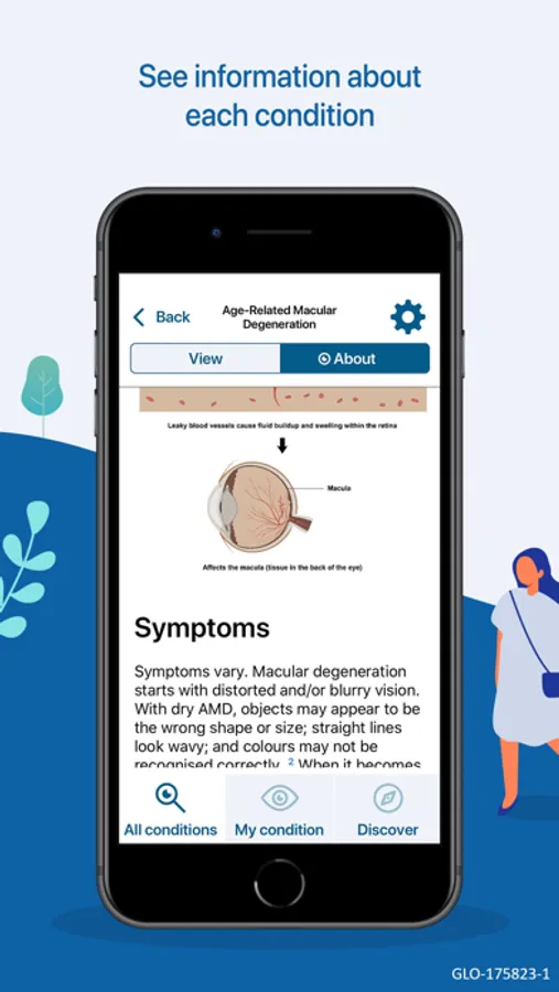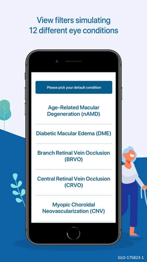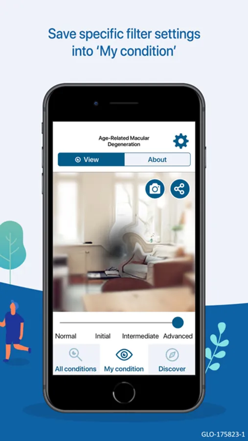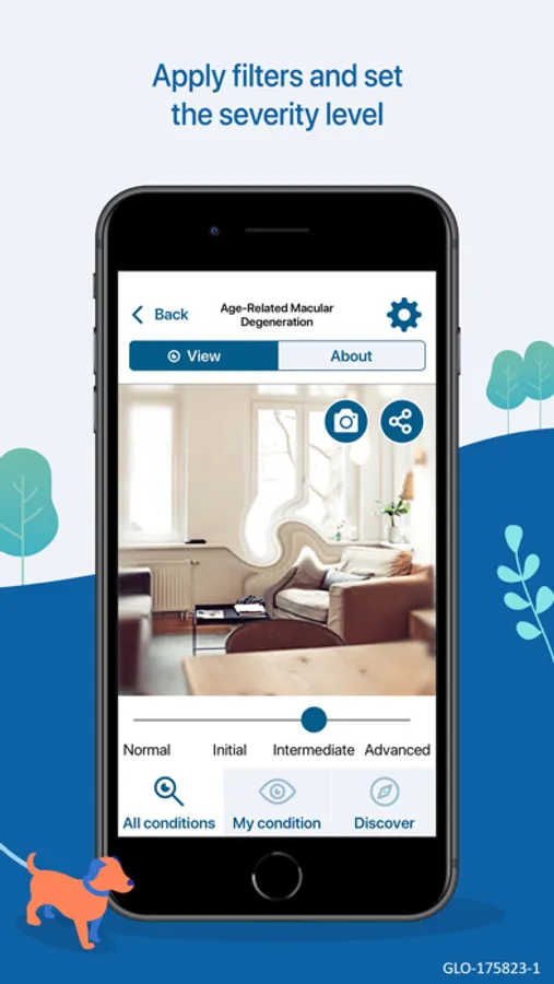 - Live simulations of 12 visual impairments which can be seen at different levels of severity: initial, intermediate, advanced (where applicable)
