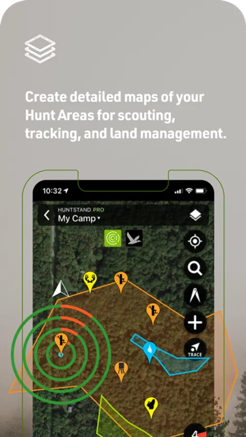 Fully map your property using more than 100 easily-discernible custom icons, shapes, and lines including scouting marks, stands, property boundaries, food plots, ponds, roads, trails, and numerous other important objects of interest.
