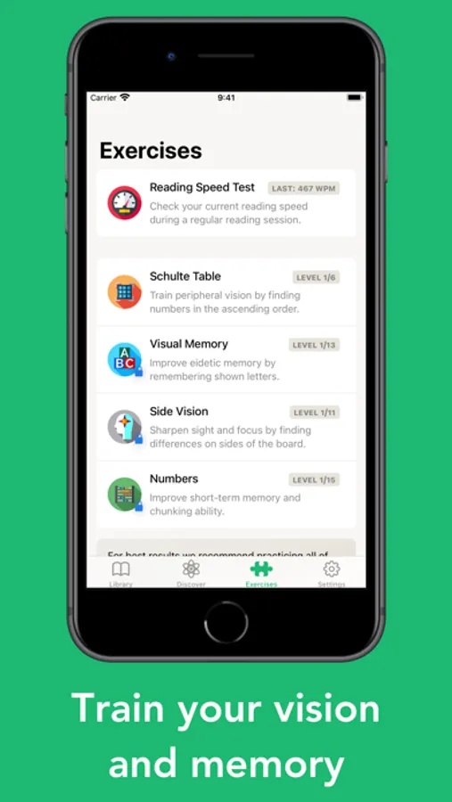 - Exercises improving peripheral vision, eidetic memory, short-term memory and chunking ability.