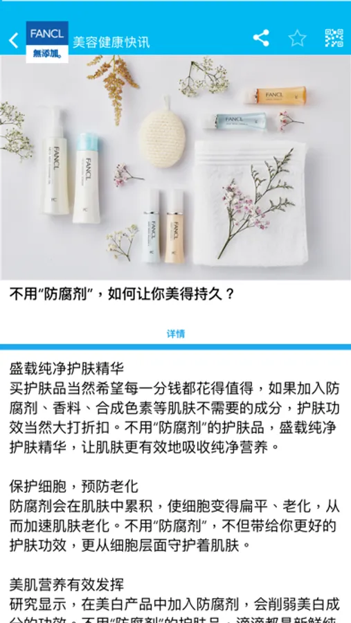 FANCL無添加,以独树一帜的“小瓶”包装,开创了“不用防腐剂,护肤更有效”的全新护肤理念。FANCL坚持无菌生产、密封包装并立即标注生产日期,确保在启封前1年、启封后60天内,产品能始终保持新鲜高活性,给肌肤更有效的修护。FANCL还是“内外美容”的倡导者,配合食补营养,内外兼修,使肌肤实现源自健康的、可持续的美丽。