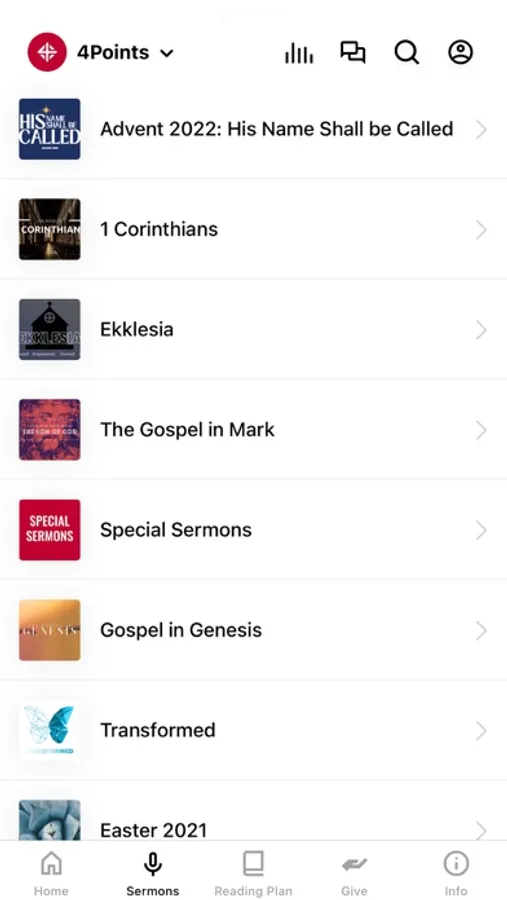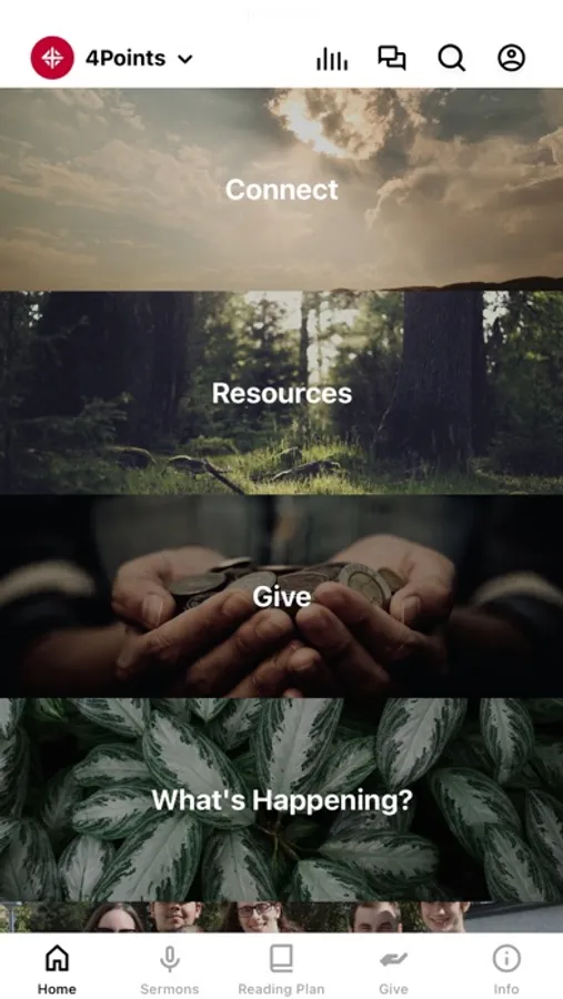 Our app connects you to a wide range of information and resources to The Church at 4Points including sermon audio/video, giving, our Bible reading plan, calendars, and more.