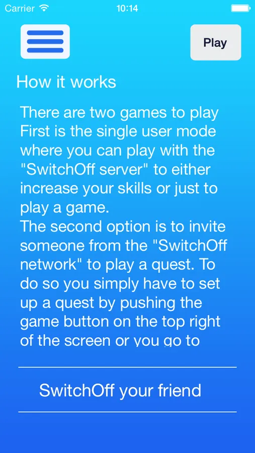 SwitchOff is a multiple choice quiz App. You can challenge friends from your contact list in the topics sports, history, movies and people. The loosers iPhone will be switched off for a declared time. You can also play by yourself but have to stick to a certain “switch off time” as well.
