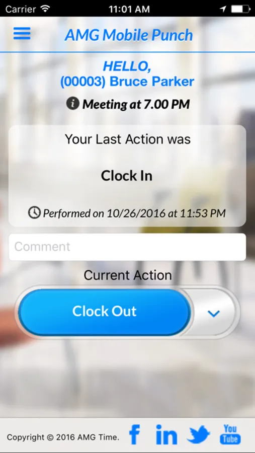 The AMGtime mobile application is a component of AMG Attendance System online solution. The application allows employees to punch in and out remotely from pre-assigned locations using their mobile phones. Mobile punches are being transferred to the system in a real-time mode. Using this application, employees can also perform department and job transfers, as well as see messages assigned by the system administrator.