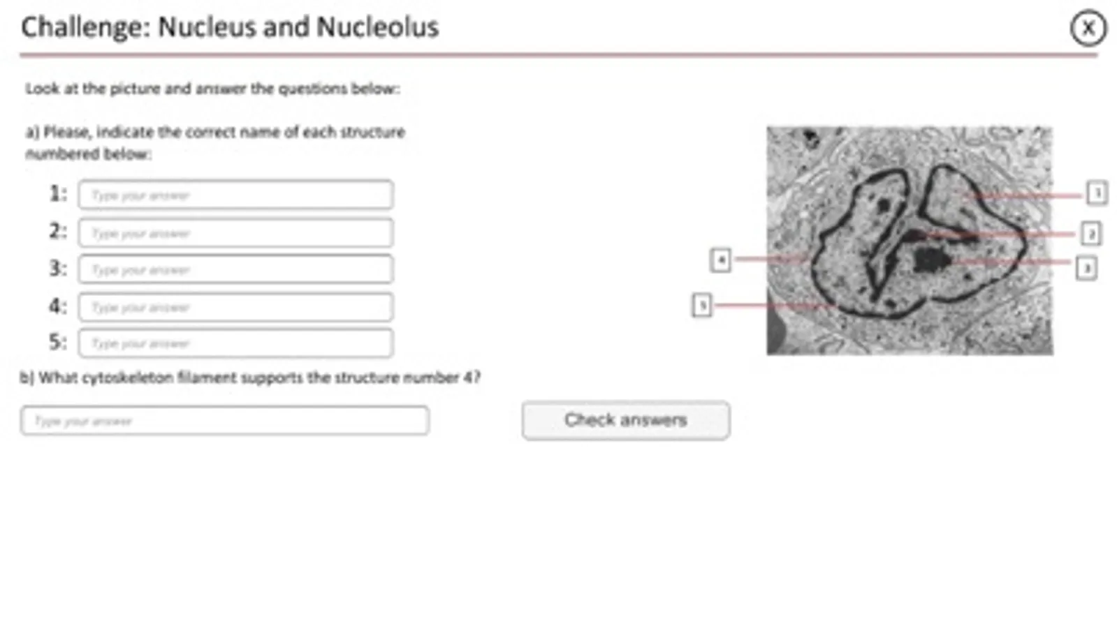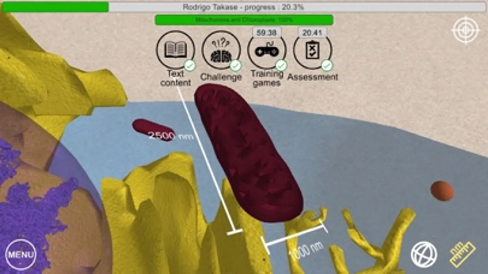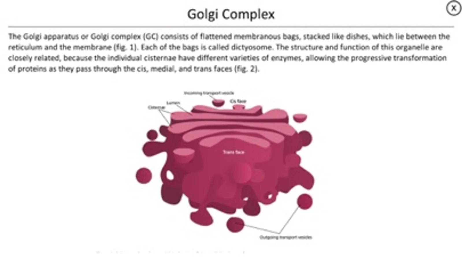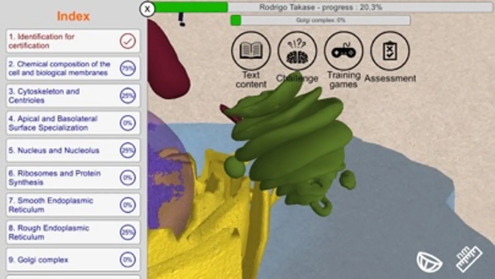 The Cell is a 3D scale model of a cell. It presents a generic model of animal cell with organelles descriptions. The size of the cell is related with the size of the organelles. A scale bar can also be shown by clicking the appropriate button.