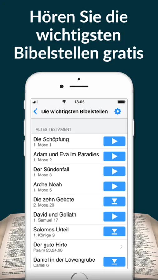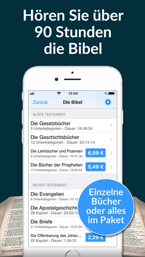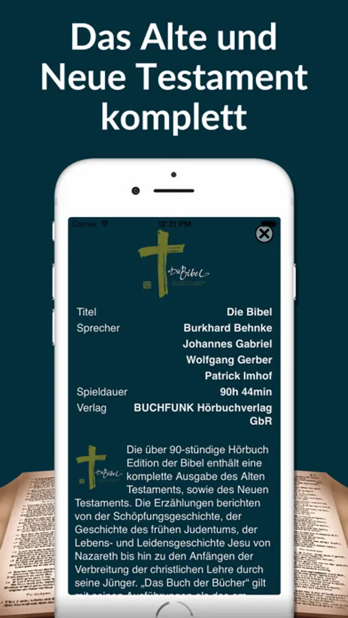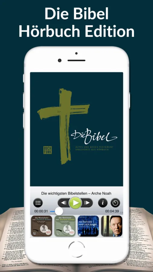 Mit der Bibel als Hörbuch erhalten Sie eine über zwei Stunden lange Hörprobe mit den wichtigsten Bibelstellen kostenlos. Ausgewählte Abschnitte aus dem Alten und Neuen Testament vermitteln Ihnen einen umfassenden Eindruck der Audioumsetzung mit der Möglichkeit das gesamte Werk (oder auch nur ausgewählte Ausschnitte) daraus zu kaufen.
