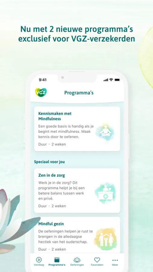 Met de VGZ Mindfulness Coach app leer je meer te leven in het nu. Kies een programma van 2 weken. Of volg één van de 100 losse oefeningen, van meditatie tot (kinder-)yoga. Allemaal in het Nederlands. Kies een stem (man of vrouw) en volg de oefening waar en wanneer je maar wilt. Er is altijd een oefening die past in jouw schema.