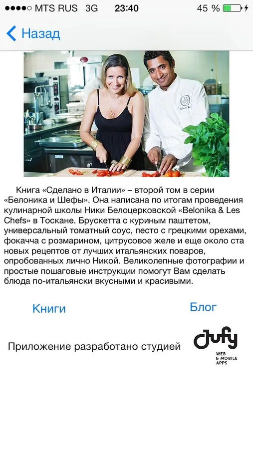 Книга «Сделано в Италии» – второй том в серии «Белоника и Шефы». Она написана по итогам проведения кулинарной школы Ники Белоцерковской «Belonika & Les Chefs» в Тоскане. Брускетта с куриным паштетом, универсальный томатный соус, песто с грецкими орехами, фокачча с розмарином, цитрусовое желе и еще около ста новых рецептов от лучших итальянских поваров, опробованных лично Никой. Великолепные фотографии и простые пошаговые инструкции помогут Вам сделать блюда по-итальянски вкусными и красивыми.