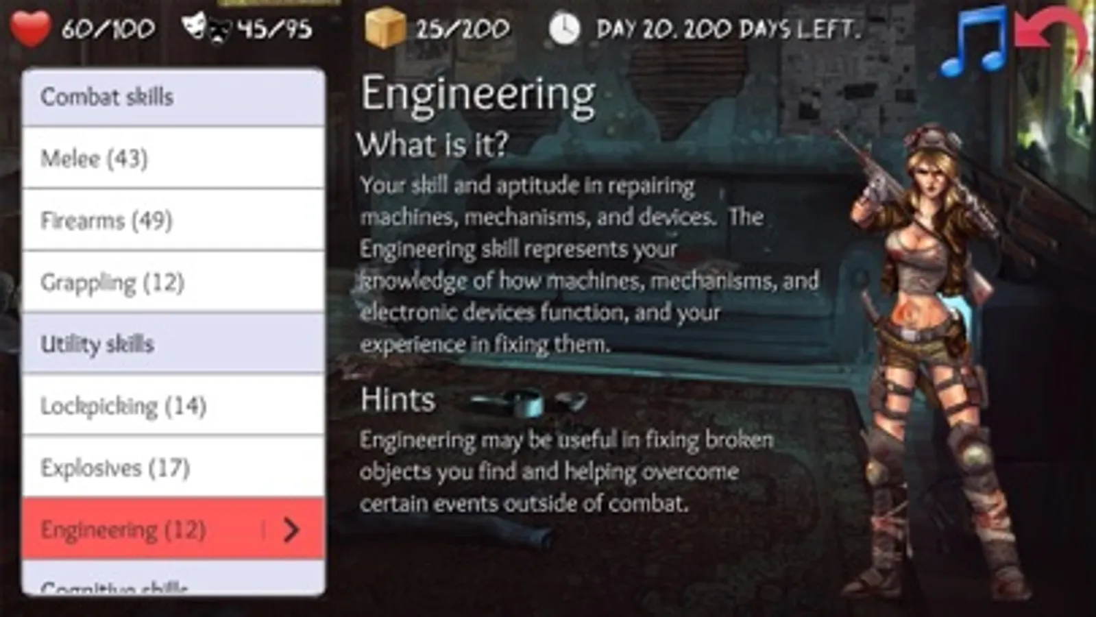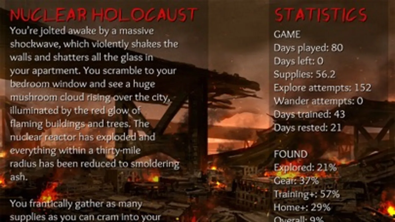 + You have a limited amount of time to escape your city before the nuclear plant goes into meltdown and destroys what remains of the city (including you)! Each day choose between exploring the city, training your skills, or resting. Learn from your mistakes and improve your survivability and score in subsequent playthroughs - this is a game that is meant to be replayed!