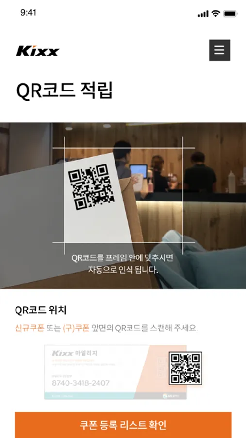 - QR코드 적립 / 쿠폰번호 적립 : QR코드 적립 및 쿠폰번호 적립 메뉴를 통하여 마일리지를 적립 할 수 있습니다.