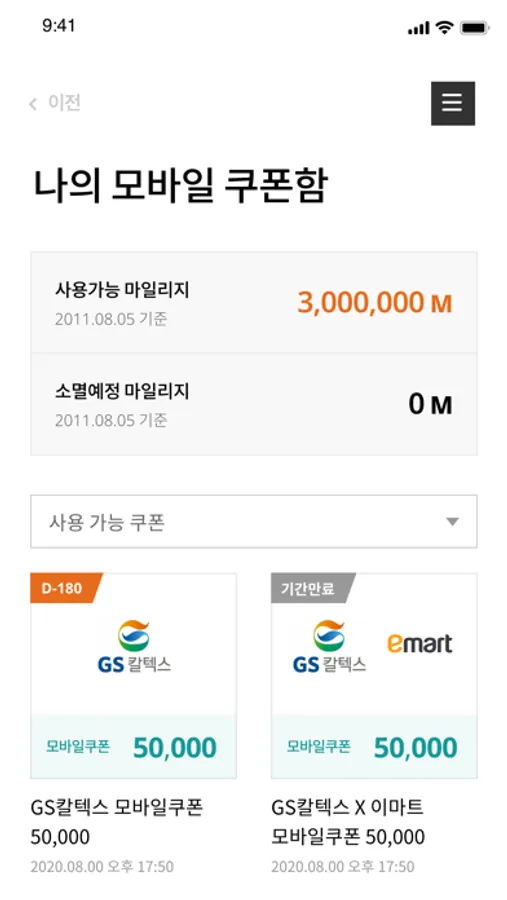 - 나의 모바일 쿠폰함 : 마일리지로 구매한 모바일 쿠폰상품의 쿠폰함이며, 사용가능쿠폰과 사용완료쿠폰 으로