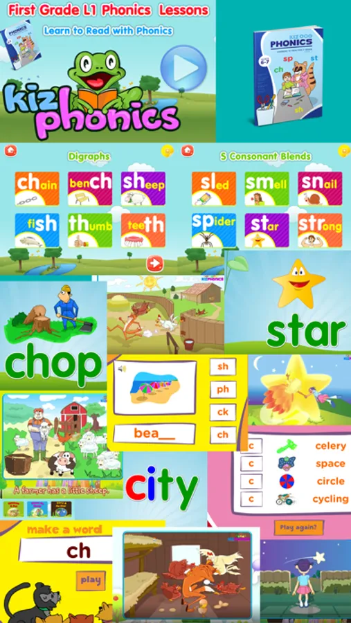 This is the lite version of the Kiz Phonics 1st Grade Level 1 App. In this phonics level, children will focus on S blends (st, sl, sw, sm, sn, sp) & H digraphs (ch, sh, th, ph, wh). This level is a jump from single letter/sound words into the realm of digraphs which are two letters that make one sound and blends which are two sounds read together quickly with each letter still retaining its sound. Children will learn that some letter combinations like 'ch' (chop) & 'sh' (shop) make a single sound. The H digraphs are important because they occur frequently in written text. Then they will learn the most common S blends in words like SLeep, SPider, SMall, STar etc. They will also learn the soft sounds of C and G in words like 'city' and 'giraffe'. There are 3 decodable stories to match the key lessons. The videos and games are part of our 1st grade Level 1 phonics program on http://www.kizphonics.com/phonics-program/1st-grade-level-1/
