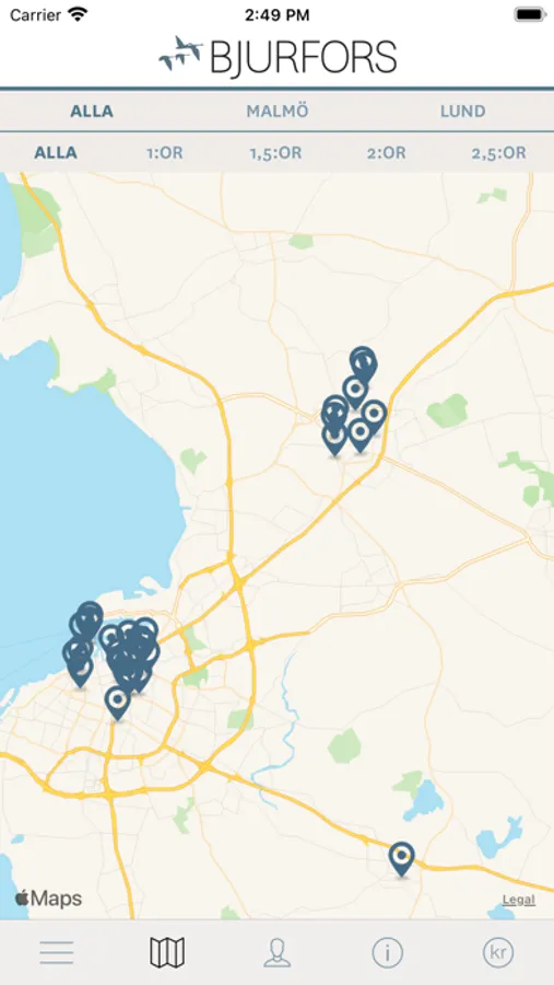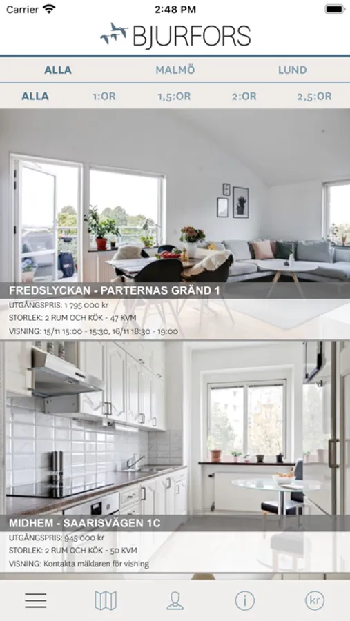 Bjurfors Studentweekend i Lund och Malmö genomförs inför varje terminsstart. Genom att samla ett större antal visningar vill vi underlätta för dig som söker efter en mindre bostadsrätt i Lund eller Malmö. I samband med visningshelgen publicerar vi alla bostäder till salu i denna app så att du lätt kan hitta vad som intresserar dig. Appen innehåller karta och lista, visningstider samt all övrig information om bostäderna. Här finns även alla kontaktuppgifter till vårt kontor och våra mäklare i Lund och Malmö.