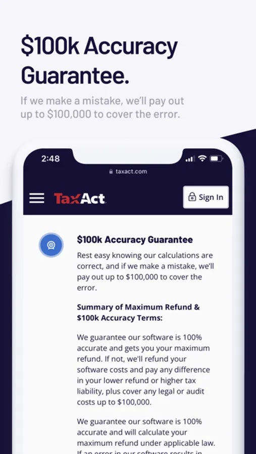 *Maximum Refund and 100k Accuracy Guarantee: If you receive a reduced refund or increased tax liability or pay penalty or interest because of a TaxAct error, we’ll cover such charges and pay you the difference in the refund or liability up to $100,000. Guarantee only applies to software errors and does not apply to errors attributable to the user. Go to taxact.com/company/accuracy-guarantee for more information.