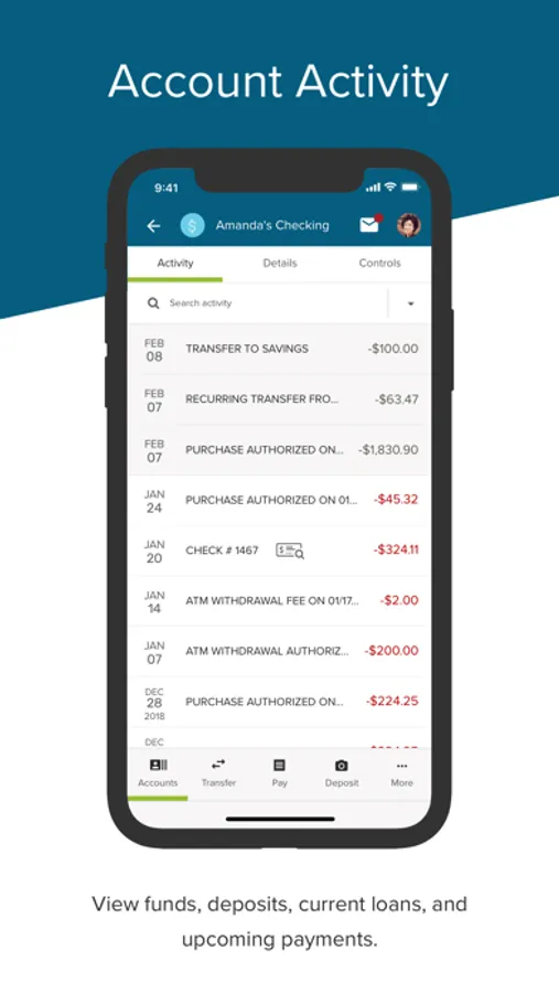 Accounts - Review recent transactions, see current balances, and search for specific payments or deposits.