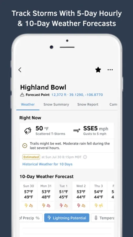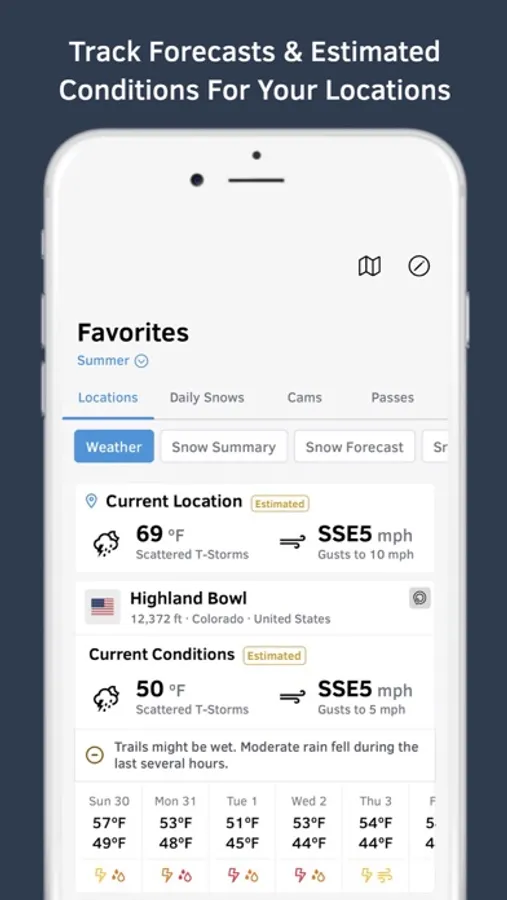 Our weather forecasts are available for any location on Earth, instantly. This means that you can view our weather forecasts for your favorite ski resort, backcountry ski location, camping destination, London, Denali, and yes, even for your home neighborhood or current location. Save up to five custom locations to view on your "Favorites" screen for quick and convenient access to the latest 10-day weather forecast and estimated snow report.