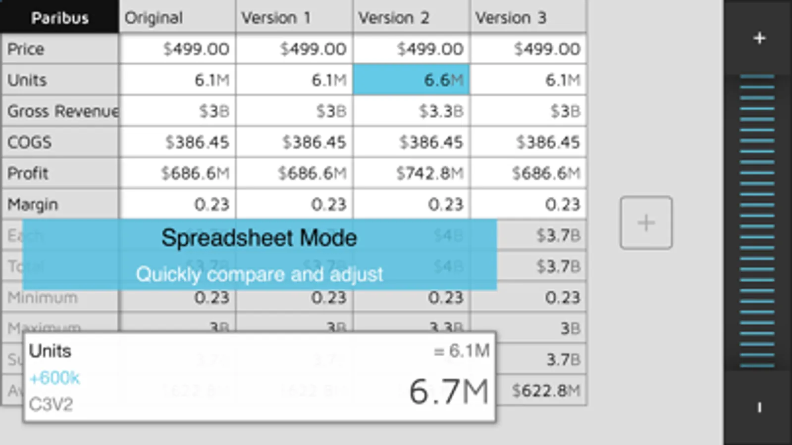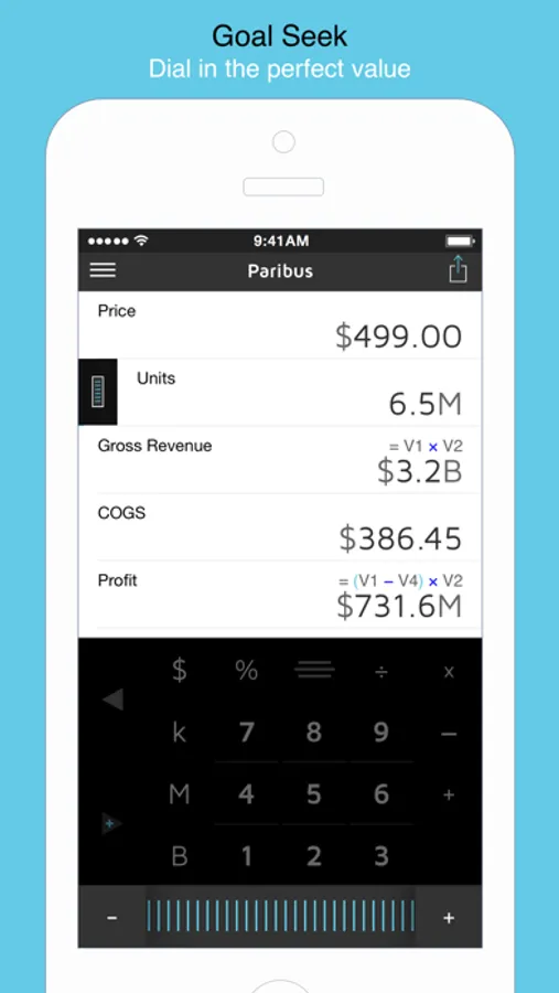 Goal Seek: Paribus has an innovative value dial that lets you spin up/down the values so you can see the effect on your results.