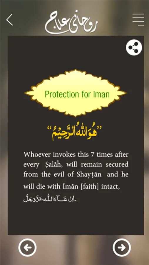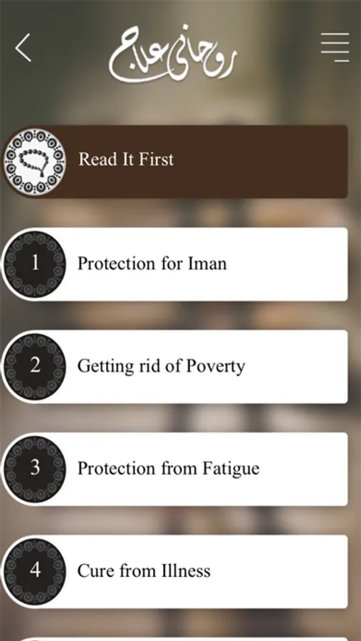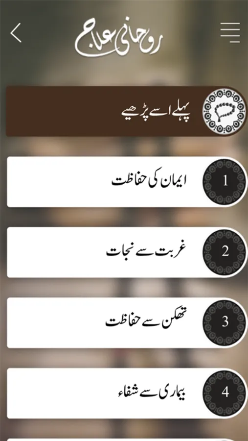 Rohani Ilaj Mobile App is based on “40 Rohani Elaj”, a booklet of Sheikh e Tariqat Ameer e Ahle Sunnat Hazrat Allama Molana Abu Bilal Muhammad Ilyas Qadri Razavi. This Mobile App is designed with beautiful layout. It includes various topics & user can easily get the Spiritual Treatment (Rohani Ilaj) of his choice. These “40 Wazaif” have been derived from Asma-e-Elahi (Names of ALLAH) with free rights of recitation for everyone. This Mobile Application includes the following Wazaif: