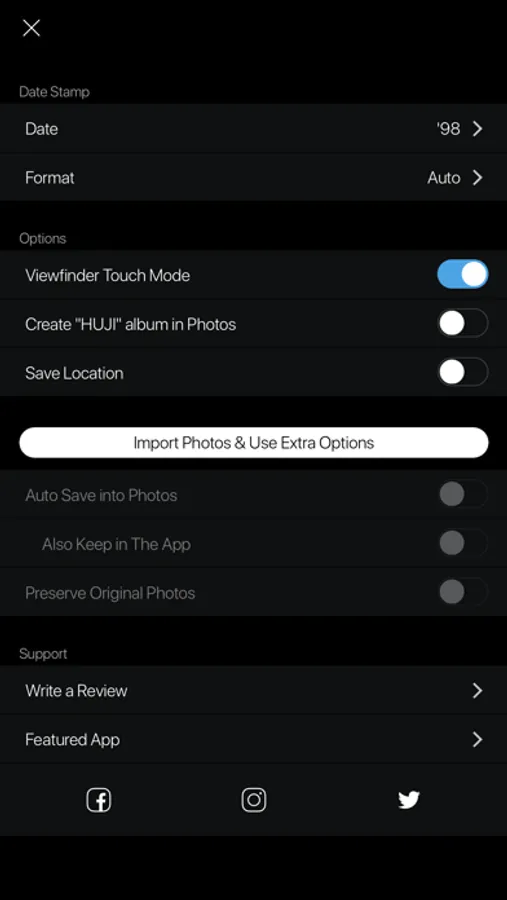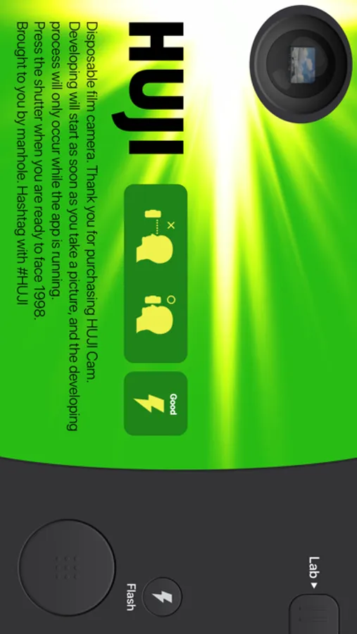 DISCLAIMER NOTICE: HUJI Cam IS PROVIDED AS MANHOLE'S OWN PRODUCT. THIS APP IS NOT THE OFFICIAL APP OF FUJIFILM OR ANY OTHERS. MANHOLE HAS MADE EVERY EFFORT TO ENSURE NOT TO INFRINGE OTHER'S COPYRIGHTS OR TRADEMARKS.