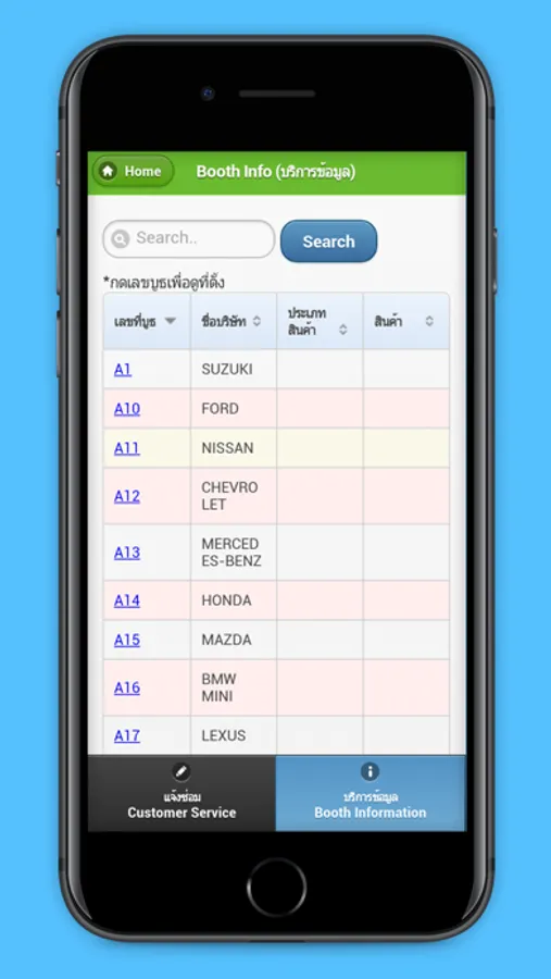 2. แสดงรายชื่อ booth และข้อมูลต่างๆ เช่น ชื่อบริษัท ชื่อสินค้า ประเภทสินค้า รวมทั้งตำแหน่งที่ตั้ง booth ภายในงานแสดงสินค้าที่เลือก