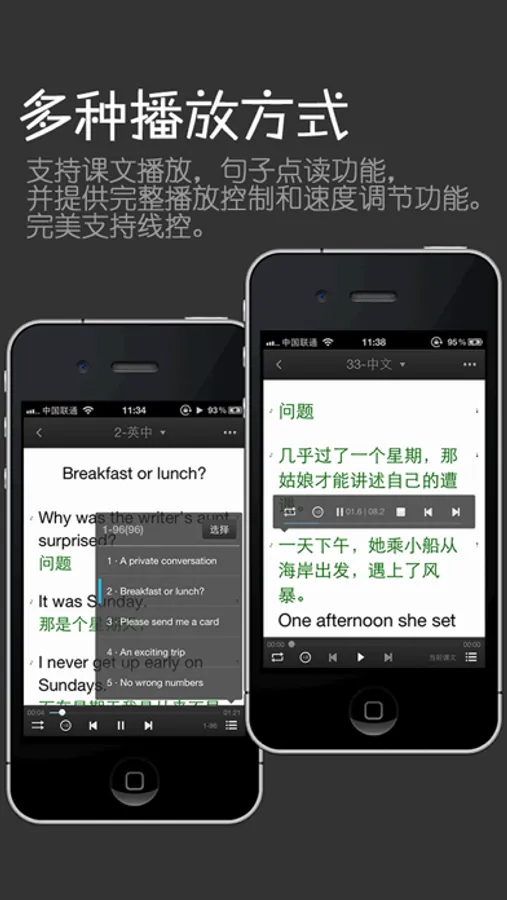 1、支持中英对照、英中对照、中文、英文四种课文展示方式,并提供展开隐藏功能。