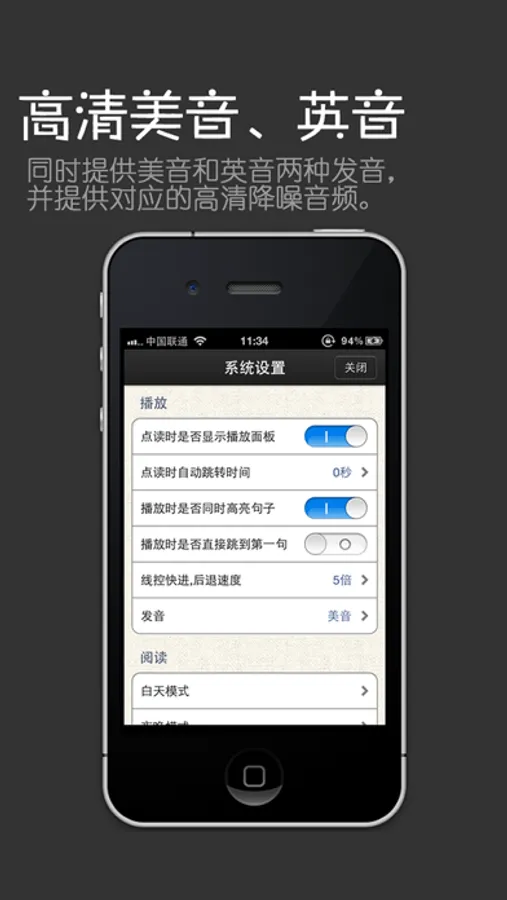 2、支持白天、夜晚两种阅读模式自定义和切换,并提供屏幕亮度调节功能。帮助您随时随地学习英语。